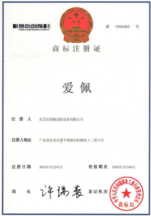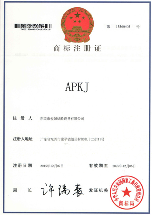 恭喜東莞市愛佩試驗設備有限公司向中華人民共和國國家工商行政管理總局(商標局)申請的“愛佩”“APKJ”商標正式通過并成功注冊,于2016年正式收到商標注冊證原件。