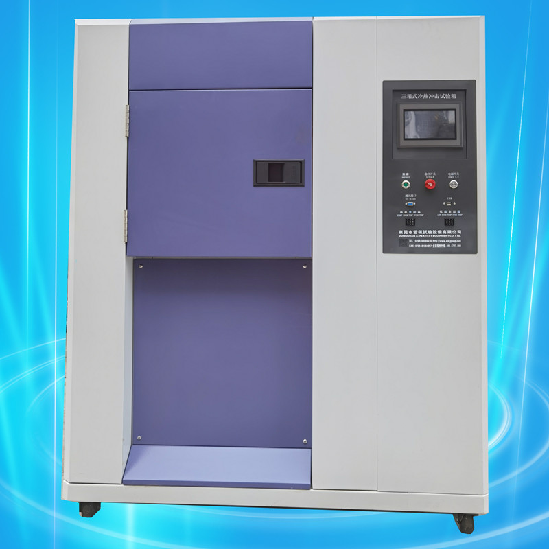 三箱設備區分為高溫區、低溫區、測試區三部分,測試樣品完全靜止于測試區。采用獨特之蓄熱、蓄冷結構,強制冷熱風路切換方式導入測試區,沖擊時高溫區或低溫區的溫度沖入測試區進行沖擊,完成冷熱溫度沖擊測試。